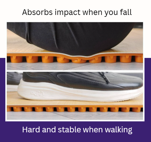 - Impact Absorption: After a fall, the flooring collapses and softens, absorbing impact to reduce the severity of injuries, minimizing the risk of fractures or bruises.